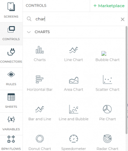 From the controls section, select the chart you want to add to display your data. DronaHQ has many charts controls including bar graph, line chart, pie chart, scatter chart, horizontal bar and many more.