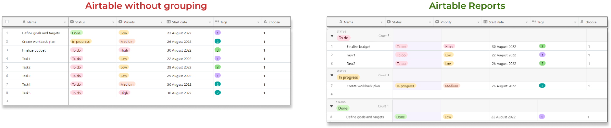 - Task Management Report: Businesses use task management tools to track team performance. A task management table can contain fields like Task Status, Task Name, Due Date, Task Priority, etc. Creating Airtable reports by grouping records based on task status and priority will separate important tasks from other tasks and improve readability.