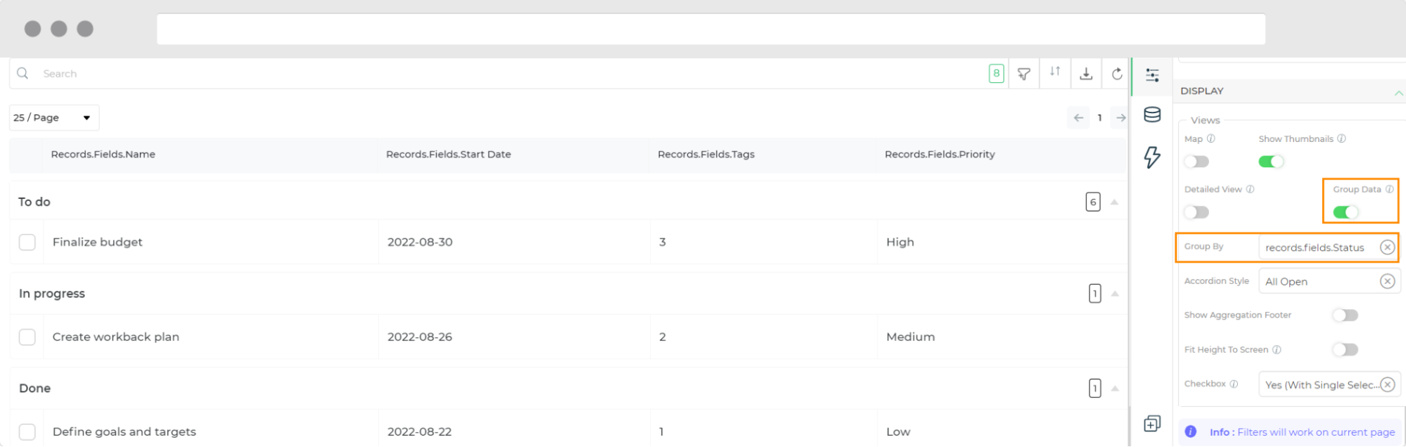 For reference, in the above illustration, we can observe that on the left side we have the table displayed by default and on the right, we have grouped the records by status field.