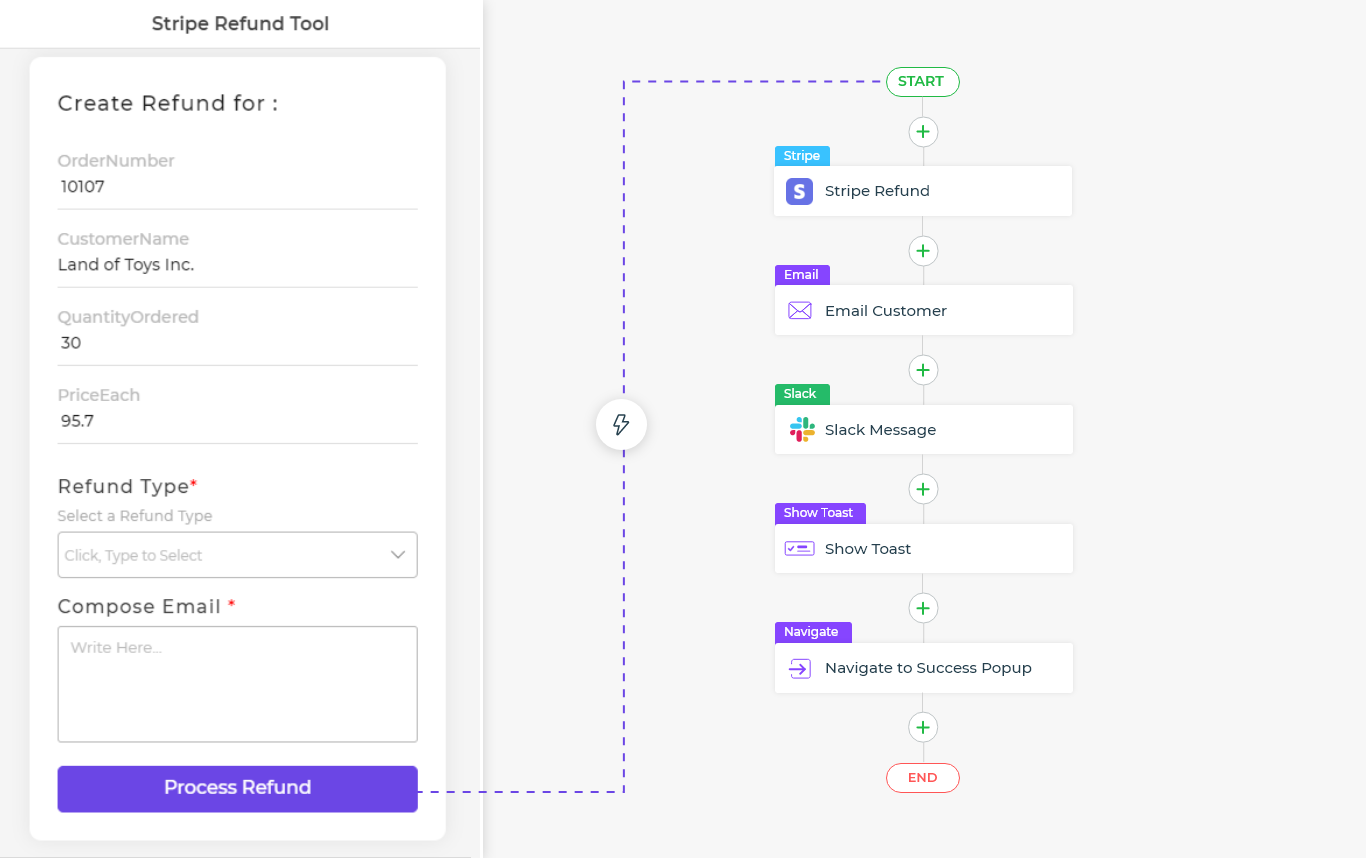 Create business flows using our visual builder to deeply integrate your application with databases, cloud services and third-party tools.