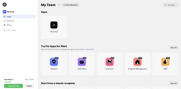 Ideally, you’d like a solution that is fast, reliable, and scales with your growth. If your app requirements are larger than a side project or a one-off task, and are likely to be used by a lot of other users and processes, you need to be looking at low-code internal tool development platforms like DronaHQ, Jet Admin, and Retool. These are easy to get started with and are highly flexible to fit a plethora of use cases and you can easily scale the tools as your needs grow.
