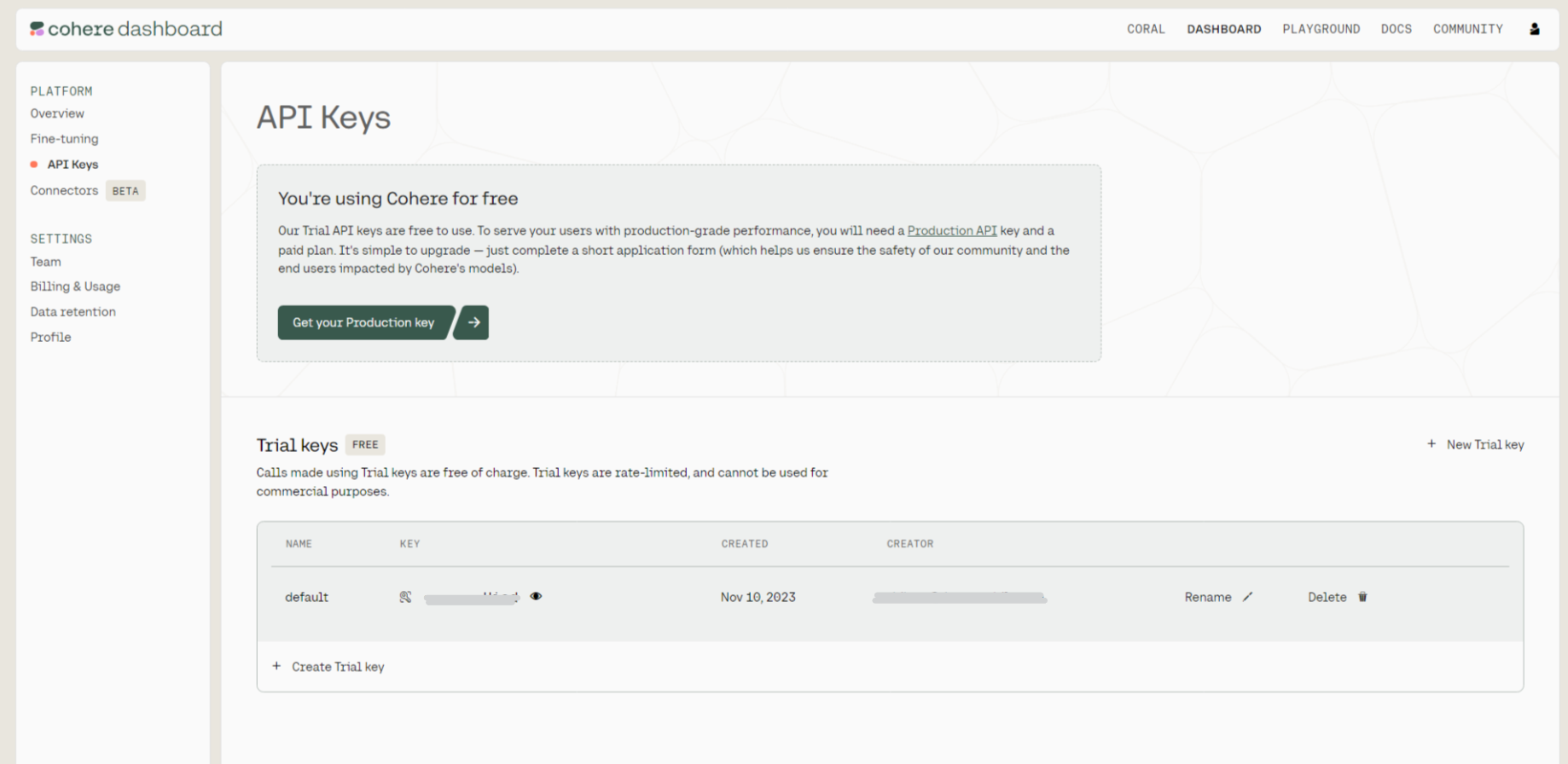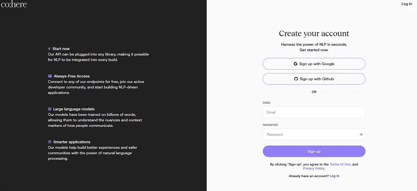 - Log in or sign up for a free Cohere account.