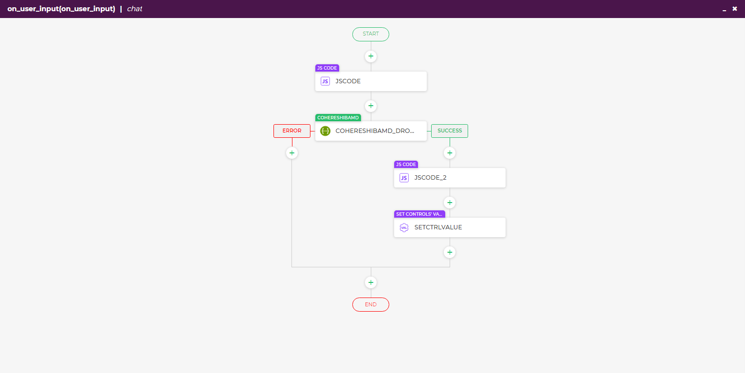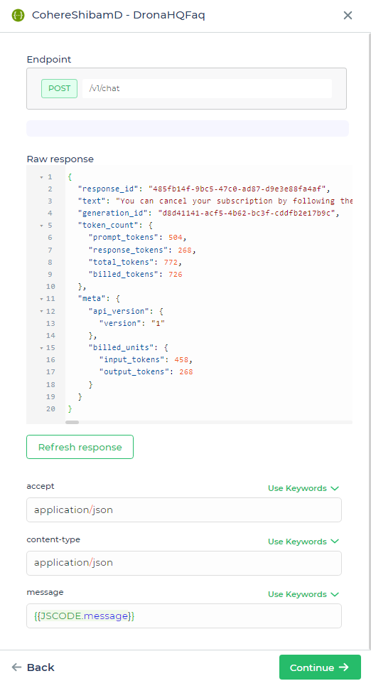 - Now add a connector block – Cohere and pass to it the Chat UI control values.