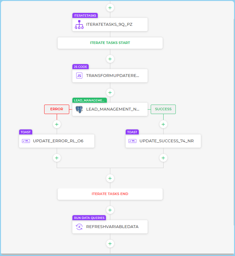 At the end add a “Run Data Queries” to refresh the table and fetch the newly edited data in the table.