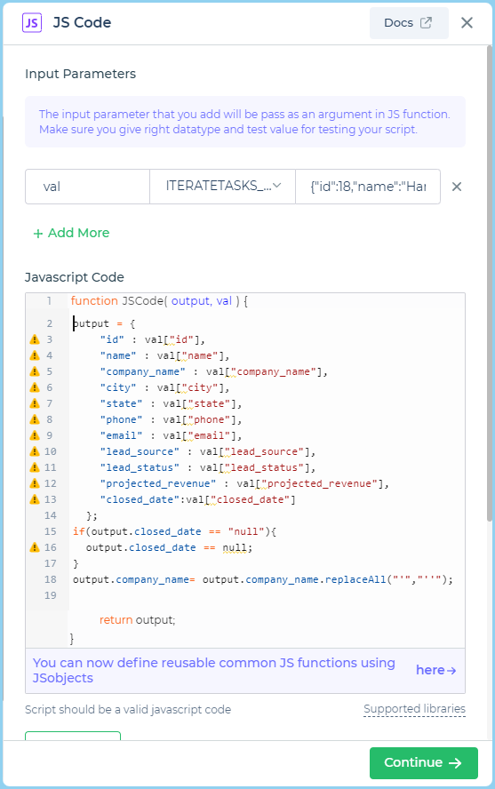 The in the JS code add a small JSCode to sanitize the data from the the current instance of the Iterate task.