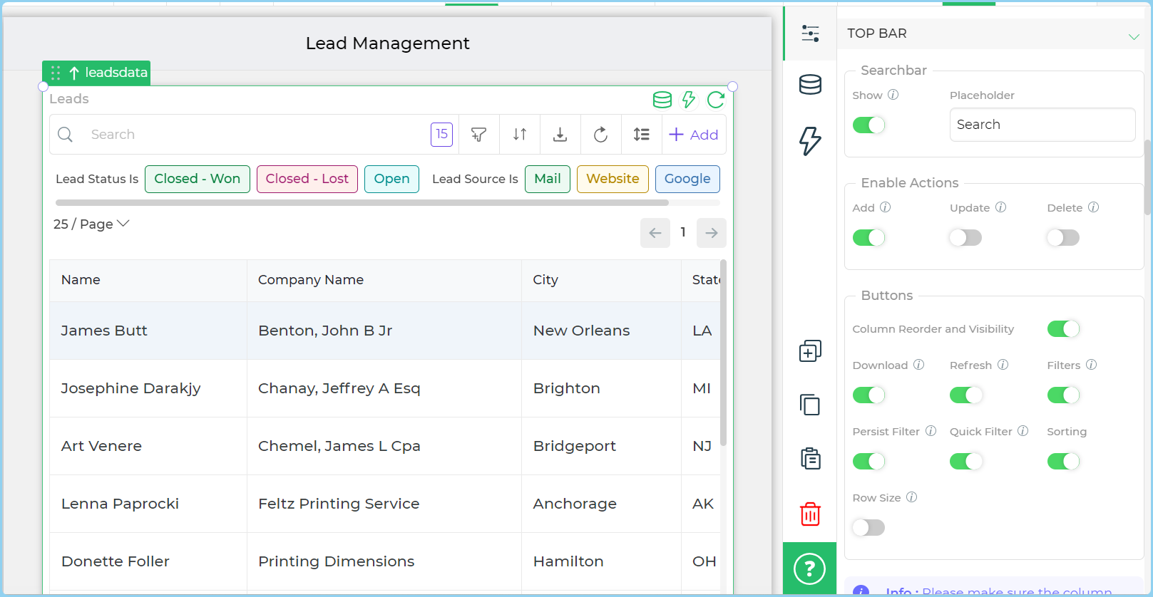 - You can also configure Tablegrid properties to enable search, filter, sort. Options to perform CRUD operations and more, by just turning on the Toggle switch