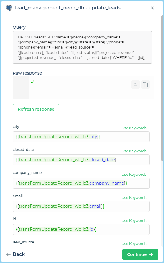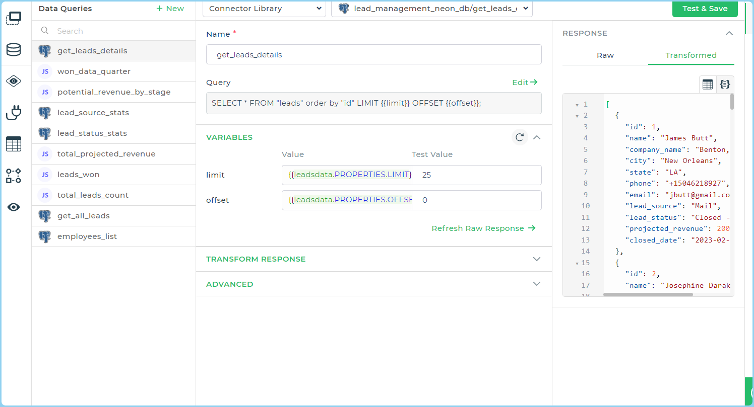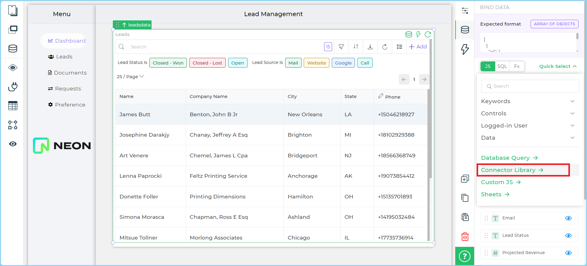 - Then a new tray will open from the bottom which you can use to bind your data with the tablegrid. We created a bunch of Data queries to pull our sales lead data from the Neon database.