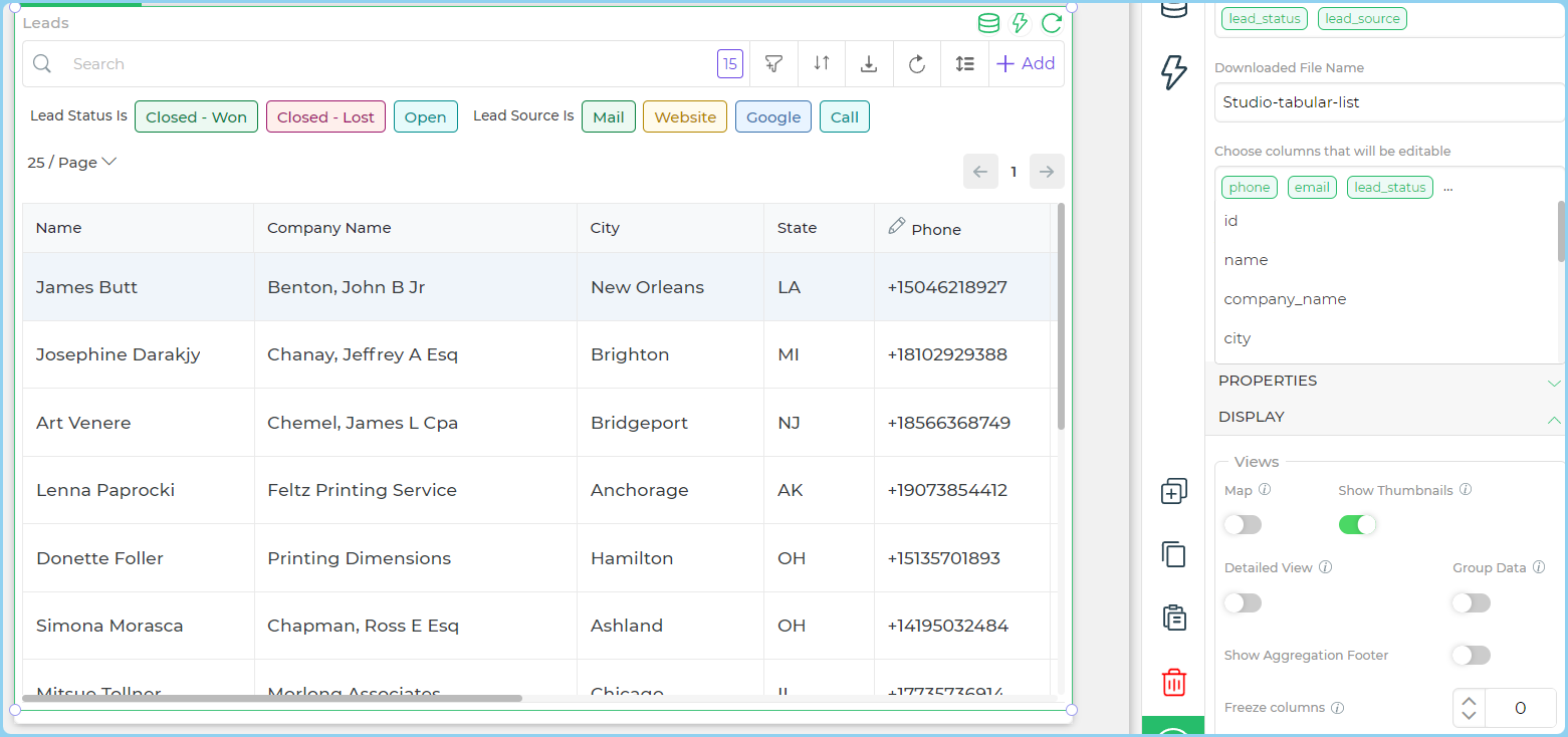 6. You can also configure Tablegrid properties to enable search, filter, sort. Options to perform CRUD operations and more, by just turning on the Toggle switch