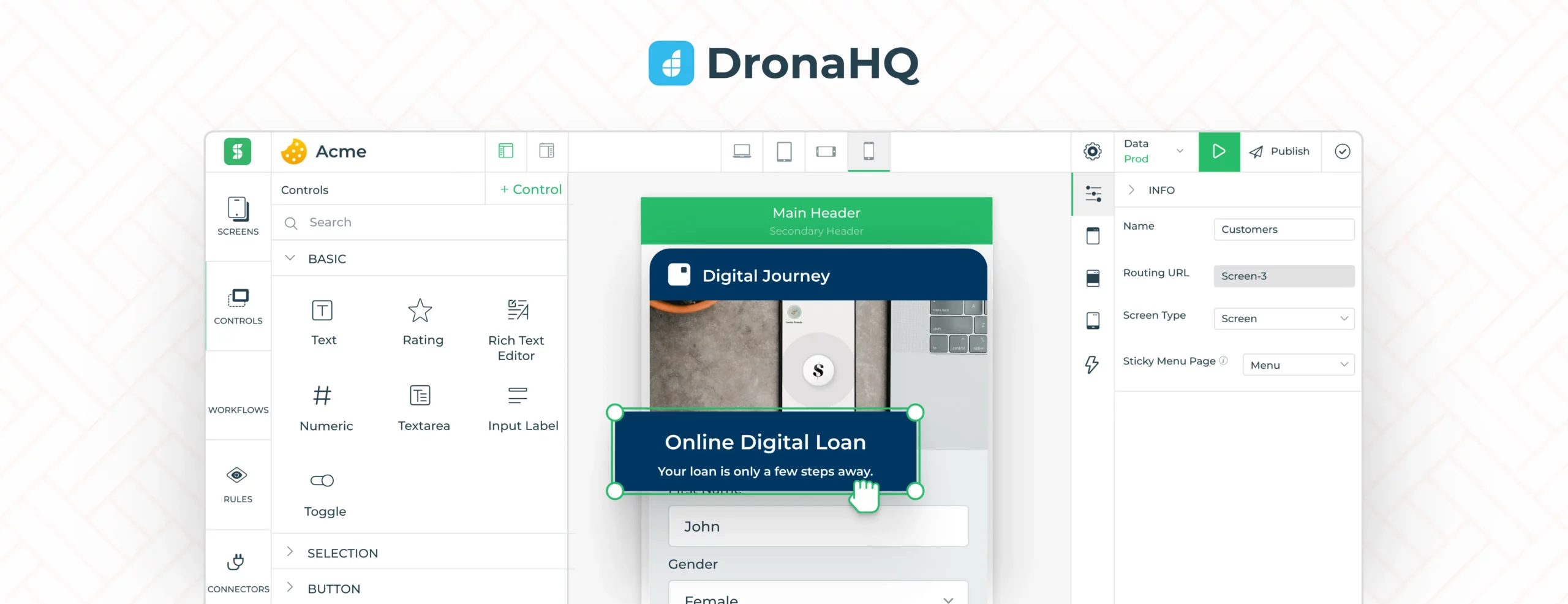DronaHQ is a low-code app development platform that offers one of the best drag-and-drop experiences for not only mobile but web apps as well. Our customers have used it to build internal tools, web portals, admin panels, CRUD apps, forms, and custom apps.