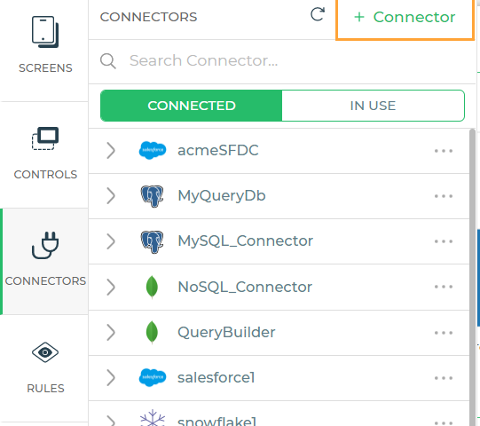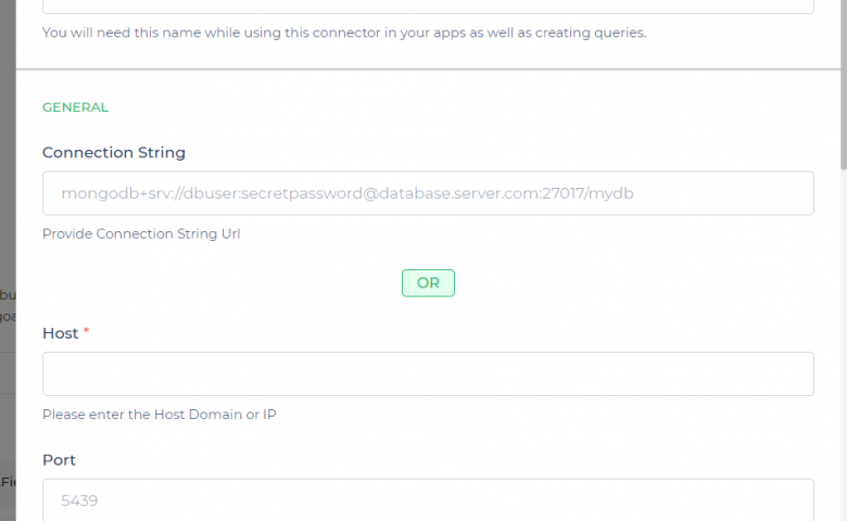 Head over to the panel menu and click on +connectors on the top left. Select ‘MongoDB’ under the connectors menu. Users have to enter a name for the connector they would like to use. This name will be used to refer to the connector in the process of app building. After a name, add a description or the purpose of the connector and click on continue.