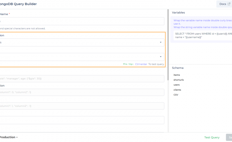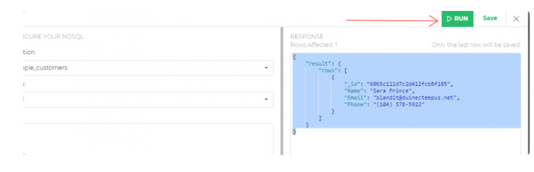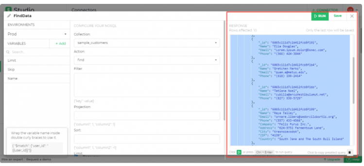 Users have to configure various actions. For example, for the ‘find’ action, the parameters would be filter, sort, limit and skip. Users can use this action to read the data After choosing, click on ‘run’ in the top right corner where you will be able to see the first 10 rows.After assigning the necessary values, you can run the query and the response will be seen as per the parameters given.
