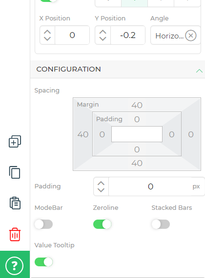 Every chart has 3 sections – data, layout, and configuration. In the configuration section, you can customize the margin, size, spacing, mode etc.