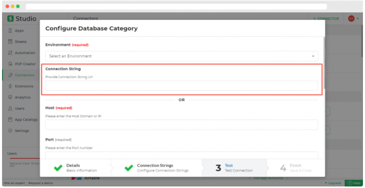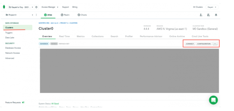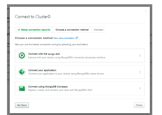Click on ‘continue’ under the connection strings menu. You will be directed to “test your connection”. When you click on ‘test’, you will be asked to select the ‘environment’ in which the connector should be available. Users can choose between Dev, Beta and Prod. After selecting the desired environment, head back to your MongoDB database to get your connection string. Move over to ‘clusters’ and click on ‘connect’.