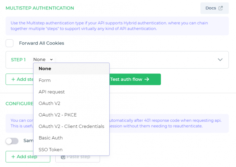 Multistep auth now supports OAuth V2 PKCE/Client credentials and SSO tokens as a step. This allows you to configure these credentials in a more secure way, and also provides a more convenient way to access them.