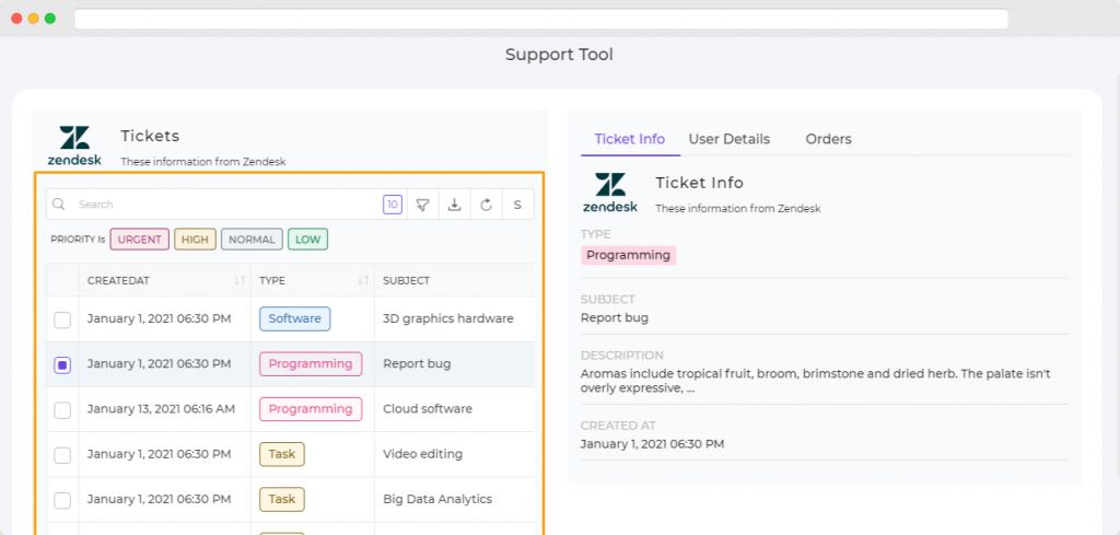 Say, a customer success manager building a customer support tool needs to keep all user details with orders placed in a single place to manage support tickets, order returns, and payments efficiently to boost ticket resolution speed. Using DronaHQ’s ready connectors, the manager can connect with Zendesk ticketing systems, PostgreSQL database, and Shopify to get customer and order details. The table grid can list down Zendesk tickets that the customer success team can sort through using priority filters and get instant access to supporting customers and order details to speed up the ticket resolution and provide their customers with faster solutions.