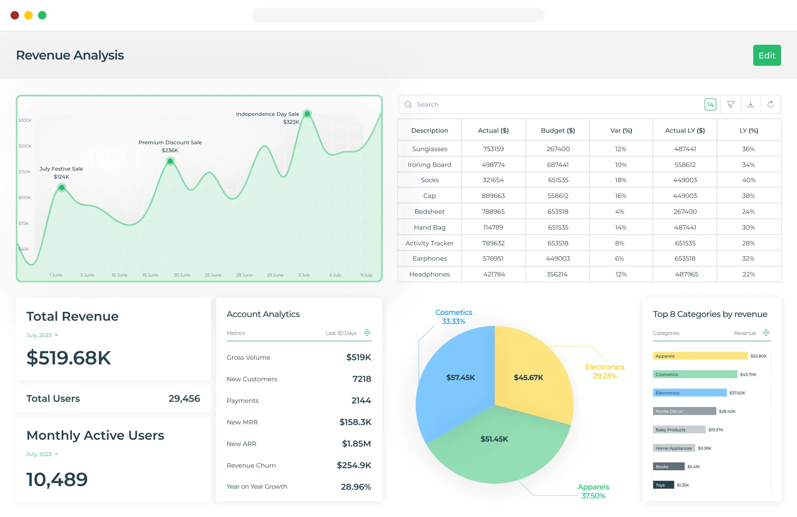 Easily create a Stripe revenue dashboard to monitor and analyze your business performance. With a ready connector fetch data from Stripe and display it in a visually appealing and intuitive format. Customize your dashboard by selecting from a range of chart and graph types to gain insights into your revenue trends. With real-time updates, make informed decisions that drive business growth.