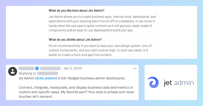 Jet Admin is a no code internal tool builder, similar to Retool, with a focus on building front end for distributed data sources. JetAdmin allows the management and visualization of application data with admin panels, dashboards, and widgets. Its simple drag-and-drop interface enables anyone to create the tools they need to manage daily operations, like tracking orders, resolving issues, and monitoring payments.